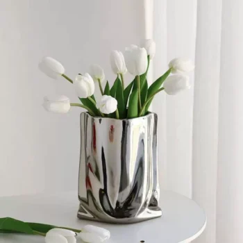 Silver Ruffled Flower Vase – Modern Ceramic Porcelain Bag Shape Terrarium