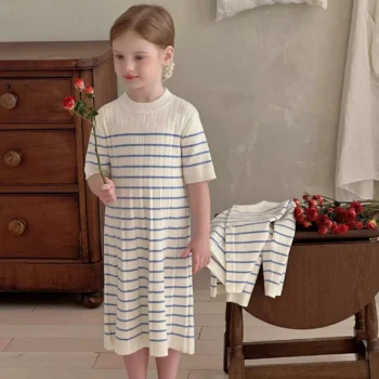 Girls’ Knitted Pleated Dress with Striped Cardigan Sweater