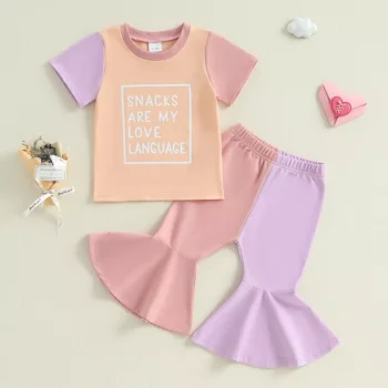 Toddler Girl Summer Outfit: Letter Print T-Shirt & Contrast Flare Pants Set